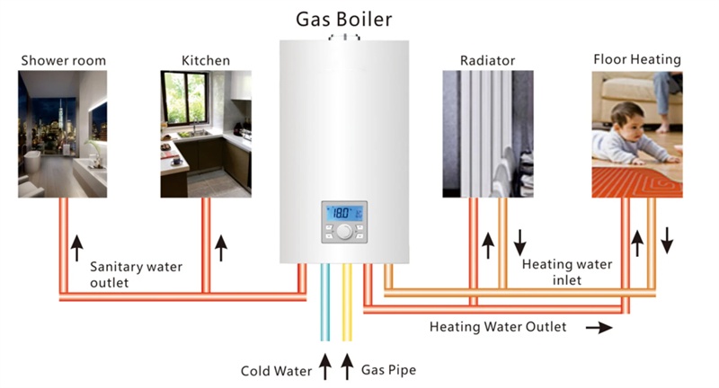Calefacción doméstica en hoteles; Caldera de gas sin tanque de condensación colgante en la pared de agua caliente